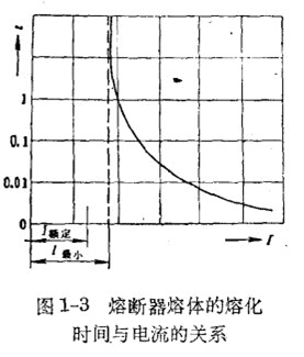 熔斷器的熔體從固態(tài)轉(zhuǎn)到液態(tài)直至汽化的過程通常叫做熔化過程,熔化過程的時間與電流的大小有關(guān)。電流愈大,熔化時間愈短。圖1-3所示為熔斷器熔體的熔化時間和電流的關(guān)系曲線。當(dāng)電流逐漸減小到某一數(shù)值時,熔化時間就趨近于無窮大,達到這一數(shù)值的電流我們稱做最小熔化電流I最小。