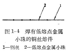 若采用銅或銀做熔體,由于電阻率小,可以做成小截面的熔體,但它們的烙化點比較高(1080℃和960℃),對于這種熔體降低熔化點的有效措施是利用冶金效應(yīng),即在銅和銀制成的熔絲上焊上低熔點的金屬小珠(如用鉛或錫,實臉證明采用錫比鉛效果好),如圖1-4所示。當(dāng)銅絲(或銀絲)上的溢度稍大于低熔點的金屬小珠溫度時,此金屬小珠即熔化,使焊接小珠部分的銅絲(或銀絲)也逐漸熔化,造成很多斷點,并產(chǎn)生電弧;當(dāng)電弧燃燒到一定長度不足以維持電弧繼續(xù)燃燒時,電弧熄滅,電路斷開。此外,尚有其他一些降低熔休熔化溫度的方法,例如采取分段用錫等措施。