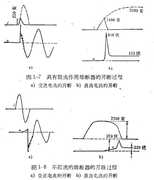 熔斷器按照開斷電流的性質(zhì)可以分為限流和不限流的兩種:所謂限流的熔斷器是指當(dāng)短路電流還未達到最大值Im時,已完成汽化、擊穿、間隙產(chǎn)生電弧和熄滅電弧的過程,并將電流2突然下降到零(圖1-7a為交流電流的開斷情況,b為直流電流的開斷情況);所謂不限流的熔斷器是指電路中的電流將從落繼續(xù)上升,’如圖1-8中的悄況。在直流時,當(dāng)電流達到接近短路電流的穩(wěn)定狀態(tài)后,待電弧拉長到不足以維持時才熄滅。在交流時,短路電流將持續(xù)到第一次電流過零瞬間媳滅電弧。有時短路電流還可能繼續(xù)延到經(jīng)過第二或第三次,電流過零瞬間才熄滅電弧。
