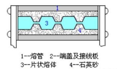 另外一種如下圖所示。熔體裝在有絕緣砂粒填料(如石英砂)的熔管內,在熔體斷開電路產生電弧時,絕緣砂粒可吸收電弧能量,金屬蒸氣能散發到砂粒的縫隙中,熔體很快冷卻,從而達到滅弧的目的。